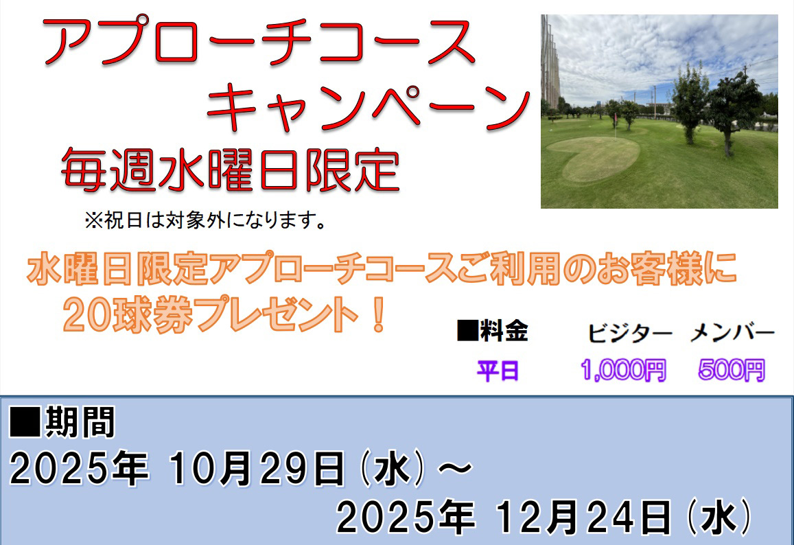 水曜日にアプローチコースを利用されたお客様へ20球券をプレゼント!!